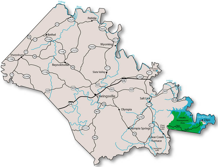 Cave Run Lake - The water flow conditions on the Licking River helps the habitat for many species of fish and wildlife. Lake visitors will find many opportunities for relaxation and fun. Boating, camping, fishing, hiking, hunting, & wildlife viewing. Elk and black bear, eagles and peregrine falcons are making a comeback in the area. (606)784-9709.