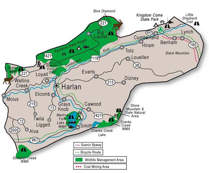 Harlan County Campground & RV Park - 8331 Hwy 119, Putney, KY 40865 (606) 573-9009. 80 RV hookups, 138 acres for primitive camping, cabins.