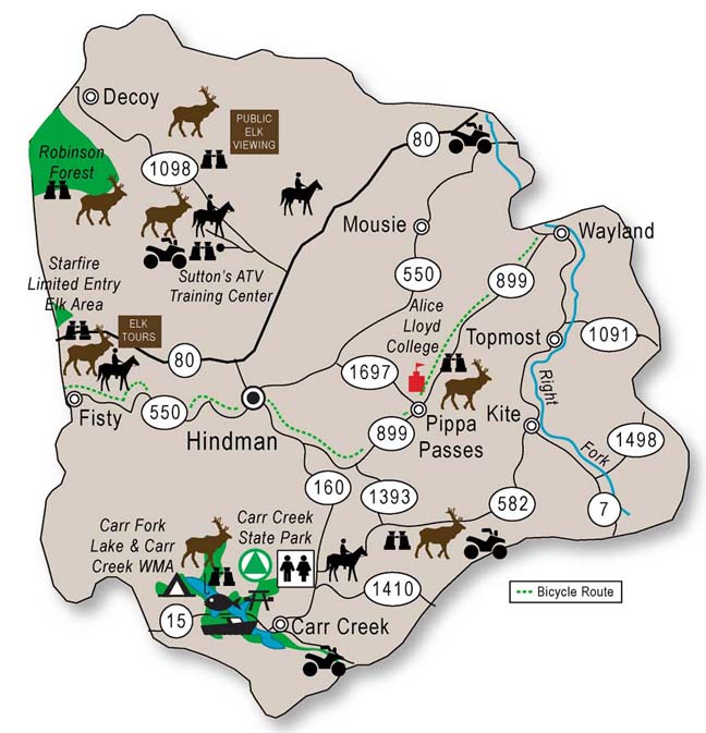 Knott County Kentucky has set up their entire county as an Adventure Tourism Park System. Knott County has become know as the "Elk Capital of the East" and there are many opportunities for adventure tourism. Check out the web pages below for more information. Click here for maps of all their adventure tourism offerings.