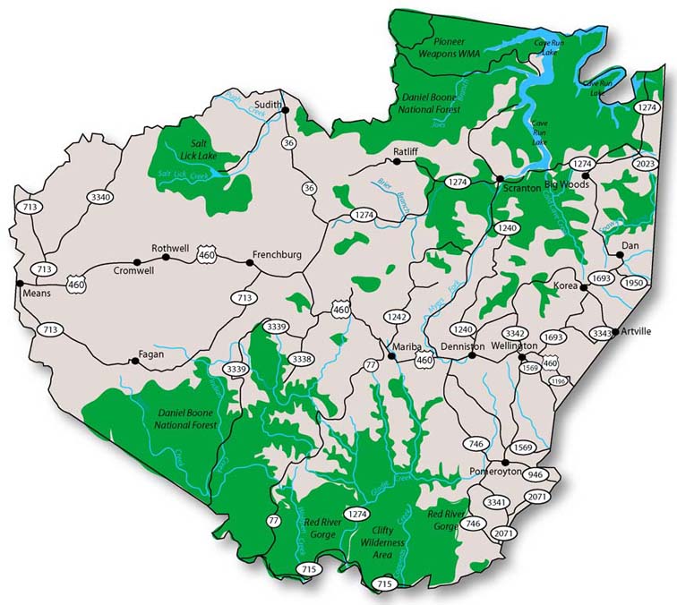 Menifee County Park - features scenic beauty and recreational opportunities for all ages. Walking path, swimming pool, ball fields, picnic shelters and children's playground. (606) 768-3482